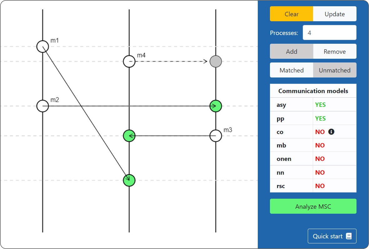 Given an MSC, the tool is able to analyze it and see to which classes of communication models it belongs. To do so, simply draw the desired MSC and then click the Analyze MSC button. The results will be shown in the "Communication models" table on the right. If the MSC does not belong to some classes, the tool will also provide a hint of why that is, which is accessible by hovering the mouse over the info icon ().